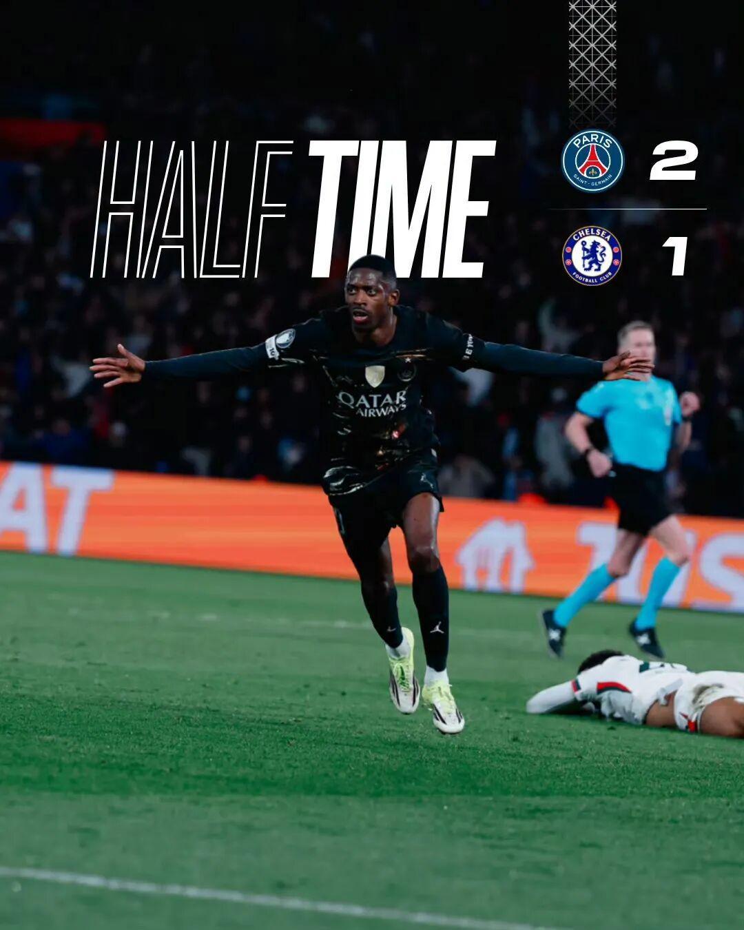 第40分钟,登贝莱长途奔袭后一对二低射破门!帮助球队在上半场结束时,暂时以2-1领先切尔西。