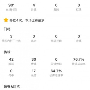 3月31日讯 FIFA系列赛,国足0-2不敌喀麦隆,颜骏凌首发出战90分钟,贡献全场最多的4次扑救,获评7.3分队内最高...